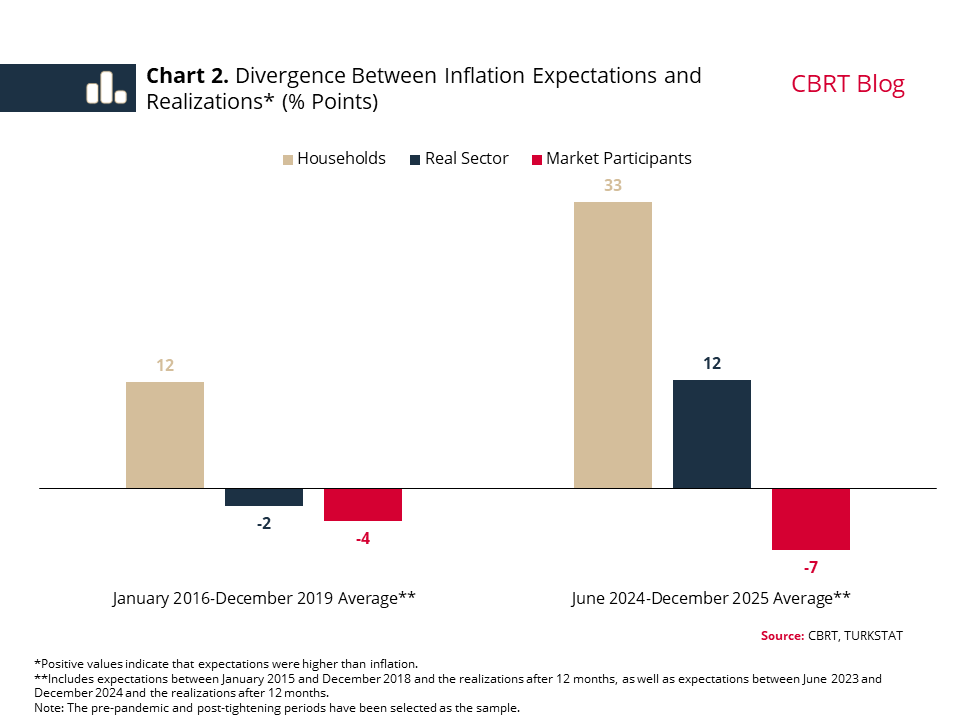 The “Sectoral Inflation Expectations” survey, shared with the public on a monthly basis, covers households and the real sector alongside professional participants. Survey results over the past decade indicate that households’ 12-month-ahead inflation expectations have generally remained well above the actual inflation (Chart 1). This gap is also evident in periods when inflation hovered at single-digit levels. While the real sector’s inflation expectations may fall below or exceed actual inflation, they display a stronger correlation with it. Market participants’ expectations, on the other hand, stand below the headline inflation, reflecting prospects of disinflation. Notably, market participants give the weakest response to volatility in headline inflation.