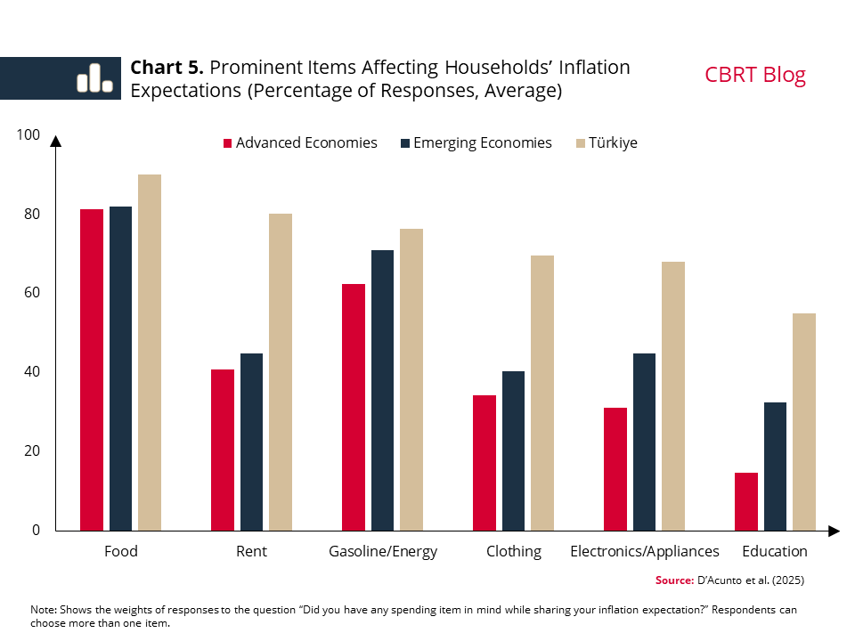Globally, regular expenditure items such as food and energy stand out in households’ inflation expectations. Findings from studies conducted specifically for the European Union also highlight these common factors.[4] In Türkiye, sensitivity to these items is generally even higher. It is also noteworthy that besides food and energy, rents also play a significant role in household expectations. Despite the recent decline, rent inflation, which has been hovering above the headline inflation for a long time, supports this divergence. The results reveal that items such as food, which are frequently consumed and rent, which occupies an important place in the expenditure basket, are important drivers of perceived inflation.