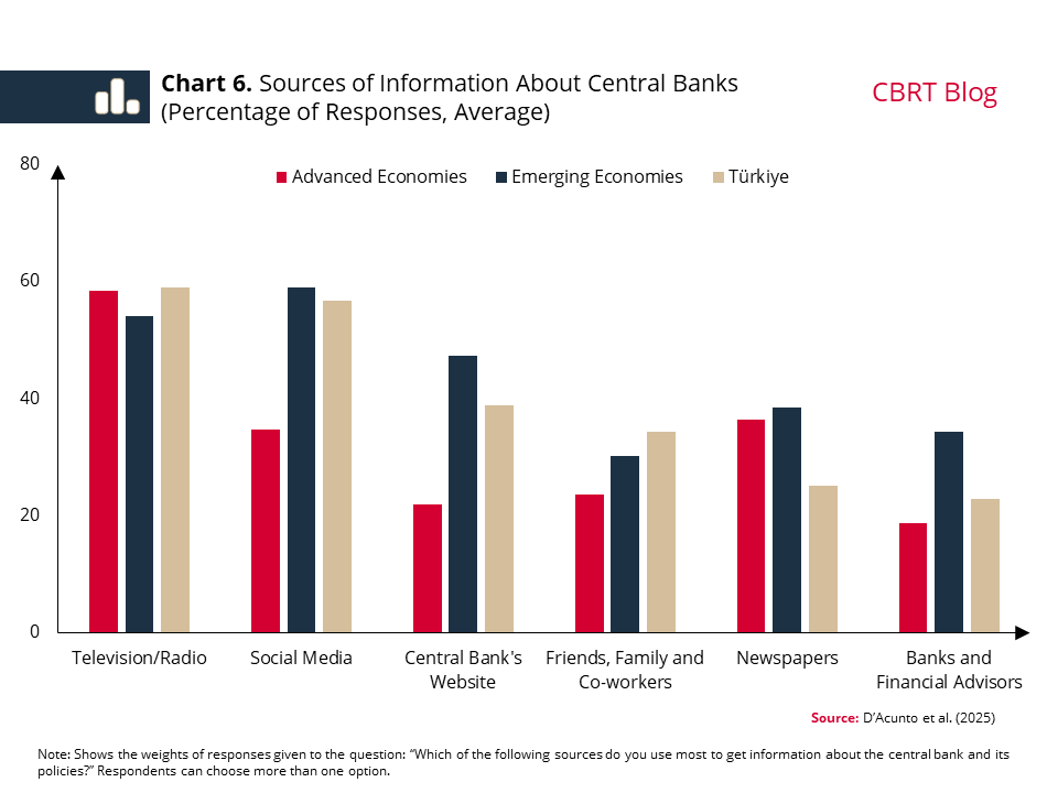 The widening gap between the headline inflation and the price increases in items with the strongest effect on perceived inflation pushes household expectations up. On the other hand, the weakening predictive power of household expectations highlights the importance of effective communication in this area. Indeed, knowledge and awareness about a central bank are known to have a significant relationship with inflation expectations.[5] At this point, households’ information sources about central banks should also be addressed. Similar to other emerging countries, social media is also a powerful source of information in Türkiye, along with television and radio (Chart 6). This reveals the importance of the CBRT’s recent communication through diverse channels for the disinflation process.