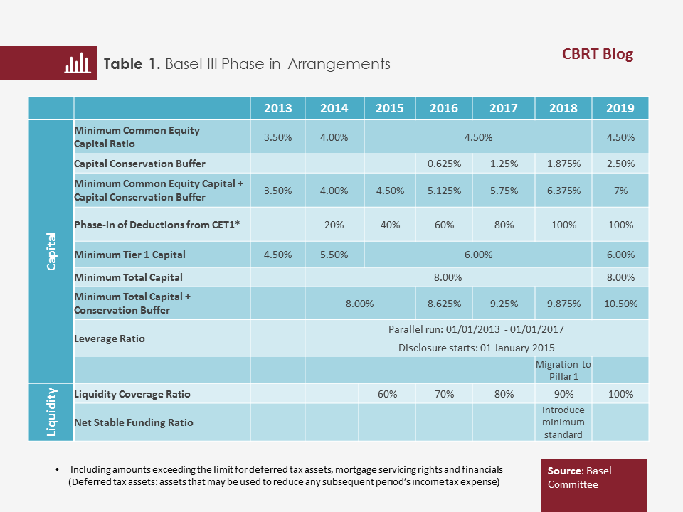 The rapid advancement in the financial sector fueled by accelerated globalization and technological progress has brought about the necessity to monitor international financial movements in particular, introduce stricter regulations for countries’ banking systems, and reduce the divergence in global regulations. In this framework, founded in 1974, the Basel Committee on Banking Supervision (the Basel Committee) issued the “Capital Adequacy Accord” called “Basel I” in 1988. Basel I set out a capital adequacy ratio which stipulates that the ratio of a bank’s capital to risk weighted assets (RWA), calculated by multiplying asset and off-balance sheet items by certain risk weights, should be no less than 8 percent. Basel I was revised in line with new developments and was finally replaced by Basel II standards in 2004. A comprehensive version of Basel II standards was released in 2006, aiming to achieve an effective risk management and supervision at banks and market discipline as well as to contribute to financial stability. After the global financial crisis, studies were initiated under the lead of the G20 to eliminate the fragilities in the banking and finance sectors, and to increase the resilience of banks to shocks. In this period, the Basel Committee prepared a transitional process calendar for Basel III standards (Table 1). The Basel III regulation consists of three simple, comparable and risk-sensitive structural pillars of minimum capital requirements, effective supervision and market discipline. The Committee aims to complete the reform process after a consensus is reached on the remaining regulations, particularly the one related to output floor[1].