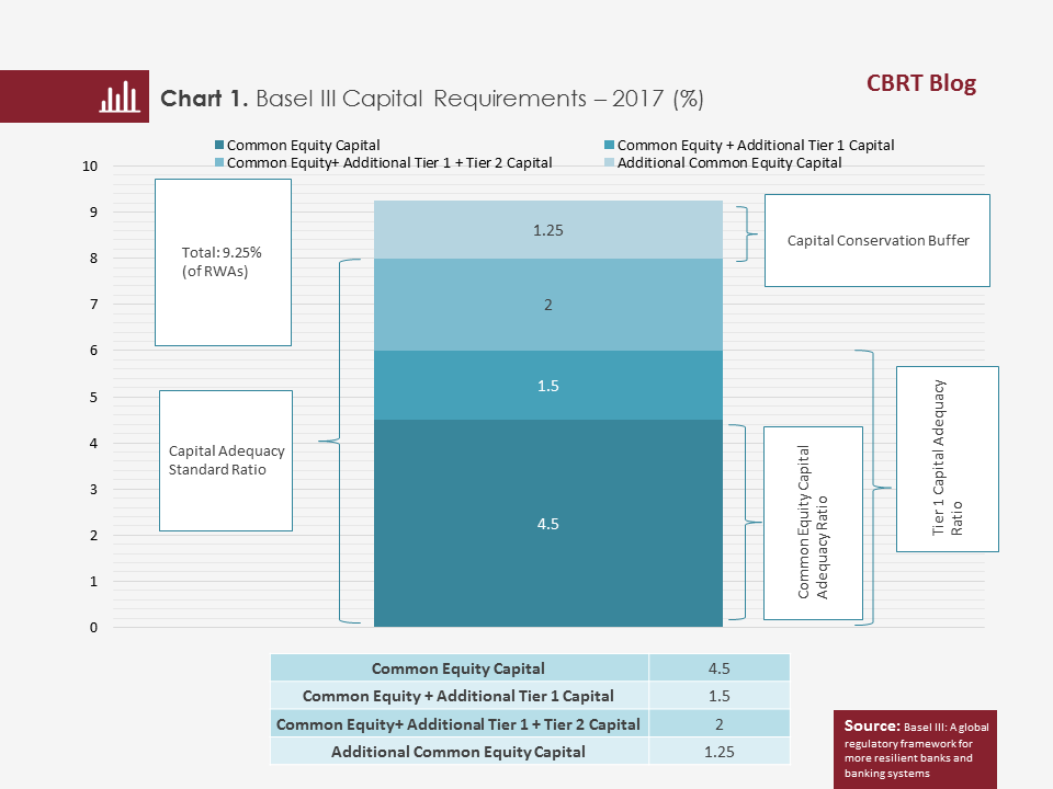 The Basel III capital regulation is intended for a higher-quality capital structure. Accordingly, capital is classified based on the capacity to absorb losses. Moreover, banks have to meet the minimum capital requirement in relation to RWAs. The regulatory framework also introduces additional capital buffers. These buffers are set to be built up of common equity capital including high-quality capital. It is planned that the capital conservation buffer[5] ratio is gradually raised from 2016 through 2019 so that it will ultimately be 2.5% of RWAs. If the capital conservation buffer requirement is not met, banks will still be able to conduct business as normal but profit distribution constraints will be imposed on banks at different rates. To factor in procyclicality, Basel standards have also introduced a countercyclical capital buffer requirement that will vary between 0% and 2.5% depending on the conditions and preferences of member countries. This countercyclical capital buffer, which will be increased or reduced according to an economy’s growth rate, is anticipated to avert rapid credit growth. Basel III capital requirements for 2017 are shown in Chart 1.