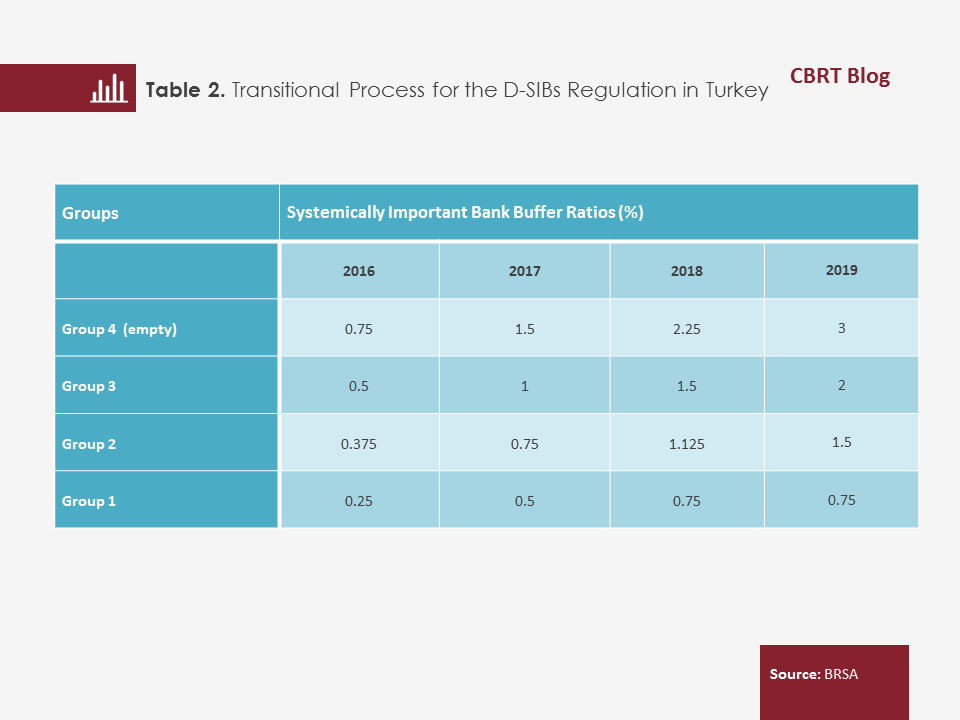 The BRSA published the “Regulation on Systemically Important Banks” on 23 February 2016. The Regulation includes an indicator-based approach for the specification of a bank’s systemic importance. This approach takes into account criteria such as size, interconnectedness, complexity and substitutability as well as the indicators and sub-indicators related to these criteria. Also, an additional common equity capital requirement is calculated for D-SIBs[7]. The transitional process for the D-SIBs regulation in Turkey is shown in Table 2.