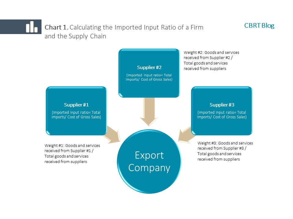 We estimated the imported input ratio on firm level by using micro data in three steps. First of all, we proportioned the imports of the company in that year according to the customs data to the cost of sales reported in the firm's balance sheet. This calculation gives us the imported input ratio used in the Amiti et al. (2014) study. In the second step, we compiled the inter-firm trade data by using the purchase and sales invoices declared by the firms. We determined the companies that each company purchases from in the supply chain and we calculated the average of imported inputs of supplier companies. While doing so, we appropriately weighed each supplier for each exporter. Then, in order to reflect the importance of goods / services received from the supply network for an exporter firm in the production / export activities of that firm, we multiplied the weighted average imported input ratio of the suppliers with the ratio of procurement cost to total sales cost of the exporter company. Chart 1 summarizes these steps in a visually simplified way. Using the same method, we went one step further in the supply chain and attained the aggregated imported input ratio in the export that we used. To sum up, the imported input ratio that we estimated is created by taking into account the imported input ratios of the exporter company, its suppliers and suppliers of suppliers.