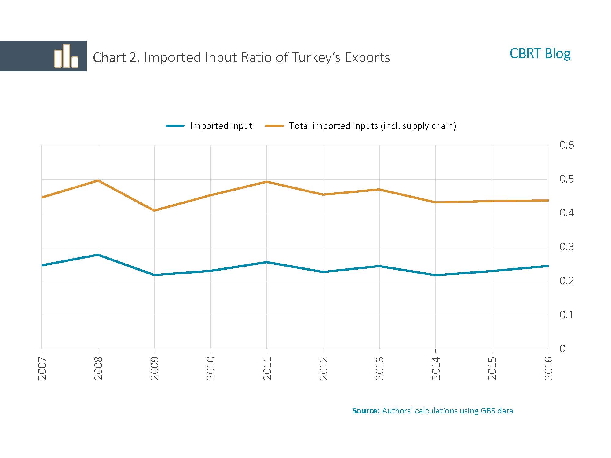 Erduman, Y. Eren, O., and Gül, S. (2019). Türkiye’de Üretim ve İhracatın İthal Girdi İçeriğinin Seyri: 2002-2017, CBRT Working Paper 19/09. (Available only in Turkish)