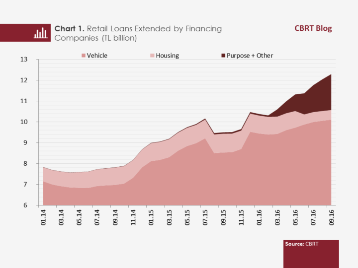 Financing company loans are widely used to finance installment payments for personal and commercial vehicle purchases. As a matter of fact, the amount of vehicle loans extended by financing companies has exceeded the amount of vehicle loans provided by banks starting from 2015. Recently, it is observed that households have been opting for financing companies for purchases when they need general purpose loans. By 2016, the number of new general purpose loans issued by financing companies over the last 12 months increased 33-fold year-on-year and reached a total number of 1.6 million. In this period, general purpose loans extended by financing companies constituted approximately 87 percent of the total retail loans in quantity and 19 percent in value.