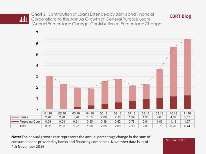 The different business model of the financing companies compared to banks paves the way for the increasing demand for their loans. Another factor pushing the demand for financing company loans is the installment limits imposed by the BRSA in 2013 on spending with credit cards. Financing companies’ accessibility to large sales networks allows consumers to have easy and on-site financing in a shorter time than general purpose loans provided by banks. Households prefer financing company loans in their spending particularly on technological products and durable goods. Therefore, the amount of general purpose loans extended by financing companies per borrower is significantly lower than those extended by banks. Despite the low level of loan balances, financing companies made a remarkable contribution to the general-purpose loan growth (both by banks and financing companies) For example, the contribution of financing companies to total general purpose loan growth, which grew by 5.7 percent in October 2016 compared to the previous year, was 1.2 percentage points. In other words, in this period, approximately 20 percent of the total general purpose loan growth came from financing companies.