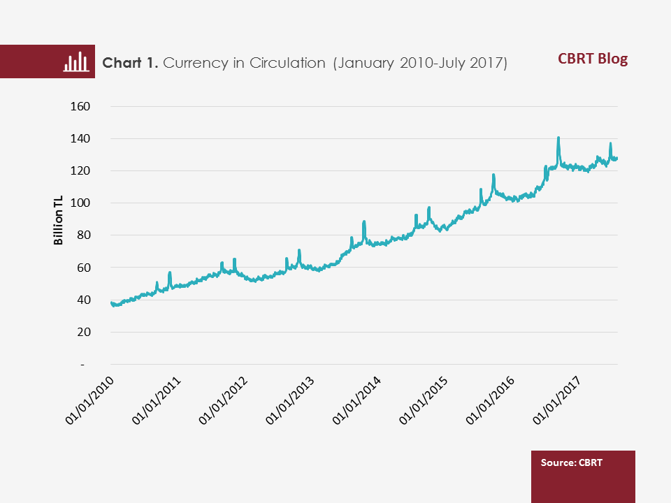 Chart 1 shows the trend of currency in circulation in Turkey over recent years. The amount of currency in circulation, which was TL 38 billion in early-2010, more than tripled and exceeded TL 127 billion by the end of July 2017.