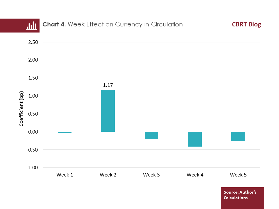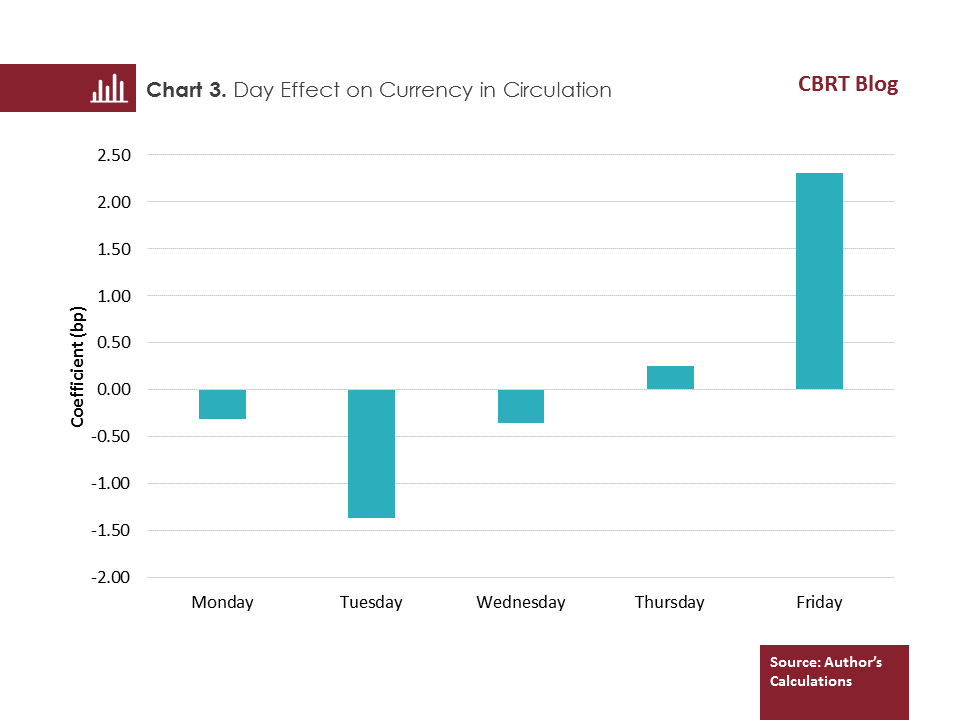 Basically, due to effects stemming from households’ increased spending needs at the weekends and banks’ loading of money into ATMs to meet the cash demand, a rise is expected in the currency in circulation particularly on Fridays followed by a decrease on the first days of the week. Therefore, we tried to detect the day effects on the currency in circulation and presented estimated coefficients in Chart 3. All coefficients are significant and this points to the fact that growth of currency in circulation systematically varies according to individual days of the week. The Friday effect in particular makes a 2.5 bp contribution to growth of currency in circulation, while the Tuesday effect leads to a 1.5 bp fall in growth of currency in circulation.