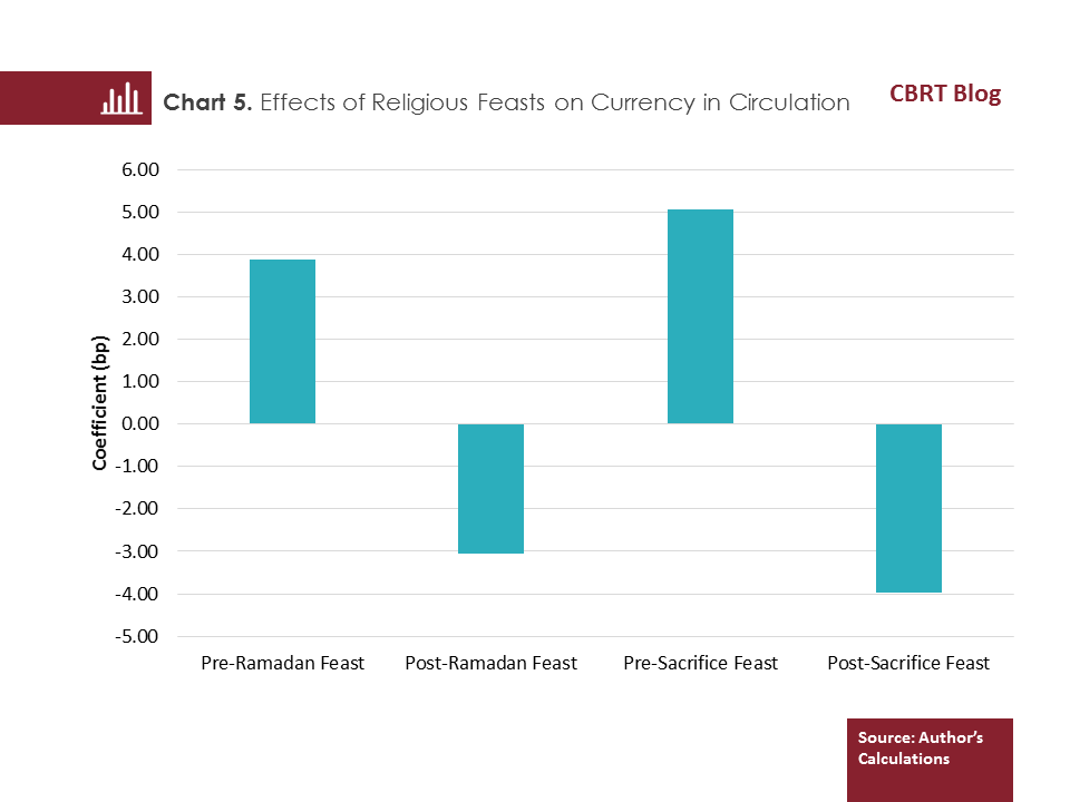 It is important to detect the calendar effect on the currency in circulation because economic activity is really robust during official holidays in Turkey. Households’ cash demand significantly increases during religious feasts which in turn increases banks’ cash demand to meet their customers’ demand. Chart 5 shows estimated coefficients for the pre- and post-holiday periods[4]. The remarkable rise in households’ cash demand before feasts makes a significant contribution to the growth of currency in circulation. While the contribution of the Feast of Ramadan (Eid al-fitr) to growth of currency in circulation is approximately 4 bp, that of the Feast of Sacrifice (Eid al-adha) is 5 bp. Currency in circulation, which rises before the religious holidays, reverts to the initial levels after the holiday. The rise in currency in circulation during the Feast of Sacrifice (Eid al-adha) is more manifest as this feast is longer than the Ramadan holiday and there is an intense cash demand for sacrificial livestock.