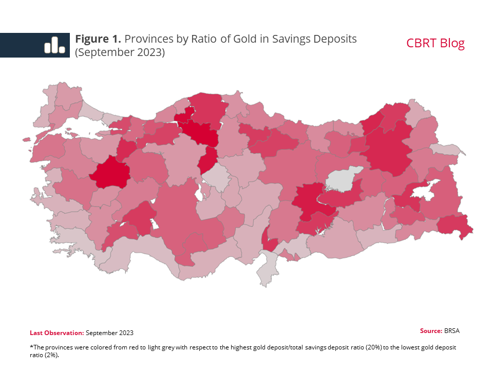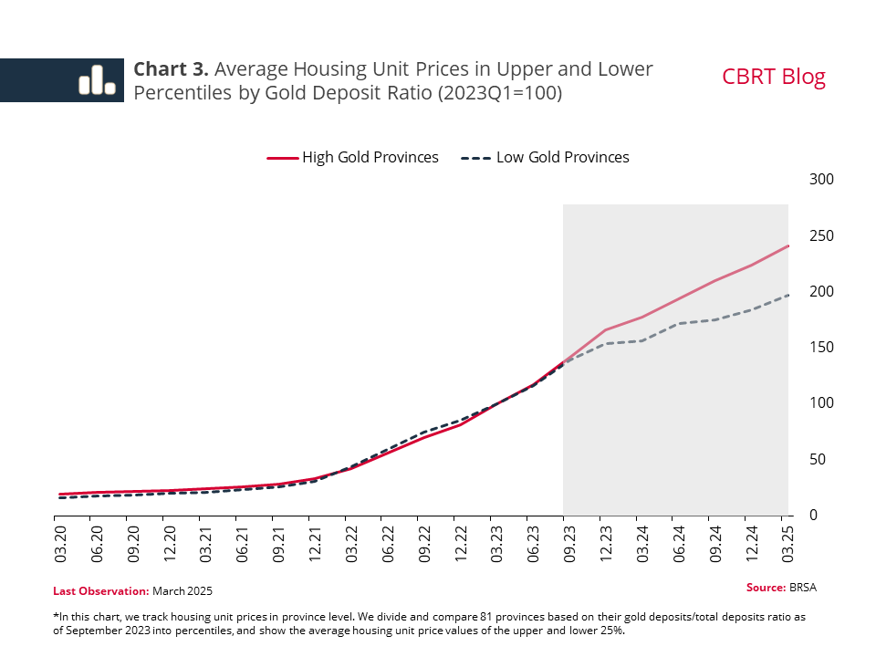 Driven by escalating geopolitical uncertainties worldwide and large-scale gold purchases by central banks, gold prices in US dollar terms surged by approximately 77% between September 2023 and April 2025 (Chart 1). In Türkiye, where gold has long been regarded as a traditional means of storing wealth, this price increase has contributed to a notable rise in the share of gold within total deposits (Chart 2).[1], [2] For households holding a significant share of their savings in gold, the price surge implied a substantial increase in wealth. Such an increase in wealth is likely to result in stronger consumer demand. In this blog post, we examine the impact of the increase in gold prices on main durable goods markets- particularly housing and automobiles- by- using the variations in gold deposit shares across Türkiye’s provinces.[3]