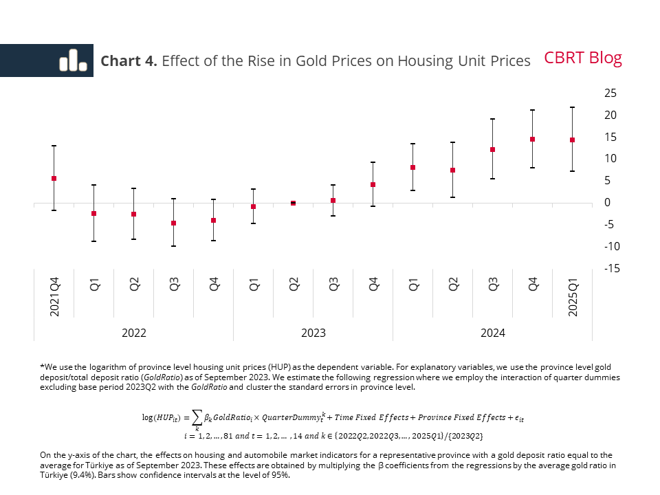 - The share of unmortgaged sales- where the wealth effect is expected to be more pronounced- in total housing sales rises relatively more as the share of gold in deposits increases across provinces. This suggests that households are using their gold-related wealth to buy homes without relying on credit, and that demand remains strong even amid tight financial conditions.