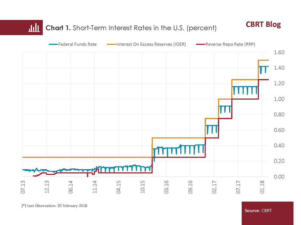 For the interest rate channel of monetary policy to work effectively, the transmission of the policy rate to short-term market rates should be strong. As a matter of fact, the transmission to short-term money market rates is the first step in the transmission to other medium- and long-term market rates (such as treasury bonds, currency swap, credit, deposit rates, etc.). Under a perfect competition structure where markets function flawlessly and all market players enjoy equal conditions with respect to market access and costs, interest rate decisions of central banks are expected to be completely passed through to money market rates adjusted for term premium and credit risk. However, in practice, the absence of perfect competition conditions, various regulations, and the divergence of market players’ (creditor/borrower) behaviors lead to deviations in the transmission of monetary policy decisions to money market rates. These deviations, which are supposed to be zero under an ideal structure of a fully effective monetary transmission, indicate a less effective transmission. For example, certain monetary policy implementations in the U.S. occasionally lead to weakened effectiveness of transmission. As government sponsored enterprises (GSEs), which hold excess reserves by definition, cannot sell these excess funds to the Fed, market rates usually remain below the interest rate paid by the Fed on excess reserves (IOER – the base level for interest rates). In 2013, with the Fed engaging more market players in the overnight reverse repo (RRP) facility, transmission to money market rates improved and the RRP rate began to form a base level for money market rates (Chart 1).