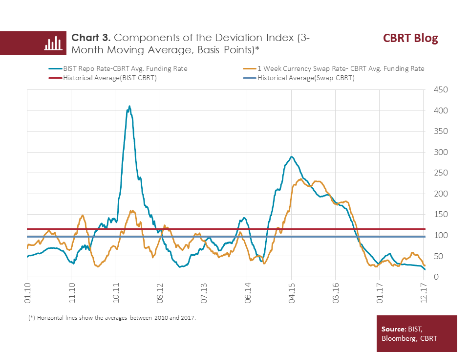 A close look at the index components (Chart 3) reveals that short-term interest rates significantly deviate from the CBRT’s weighted average funding rate in some periods due to the active use of the interest rate corridor. Foreign Exchange Deposits against TL Deposits Auctions introduced by the CBRT in early 2017 are also considered to have contributed positively to the downtrend in the deviation index by facilitating a more concerted movement of currency swap rates with other money market rates.