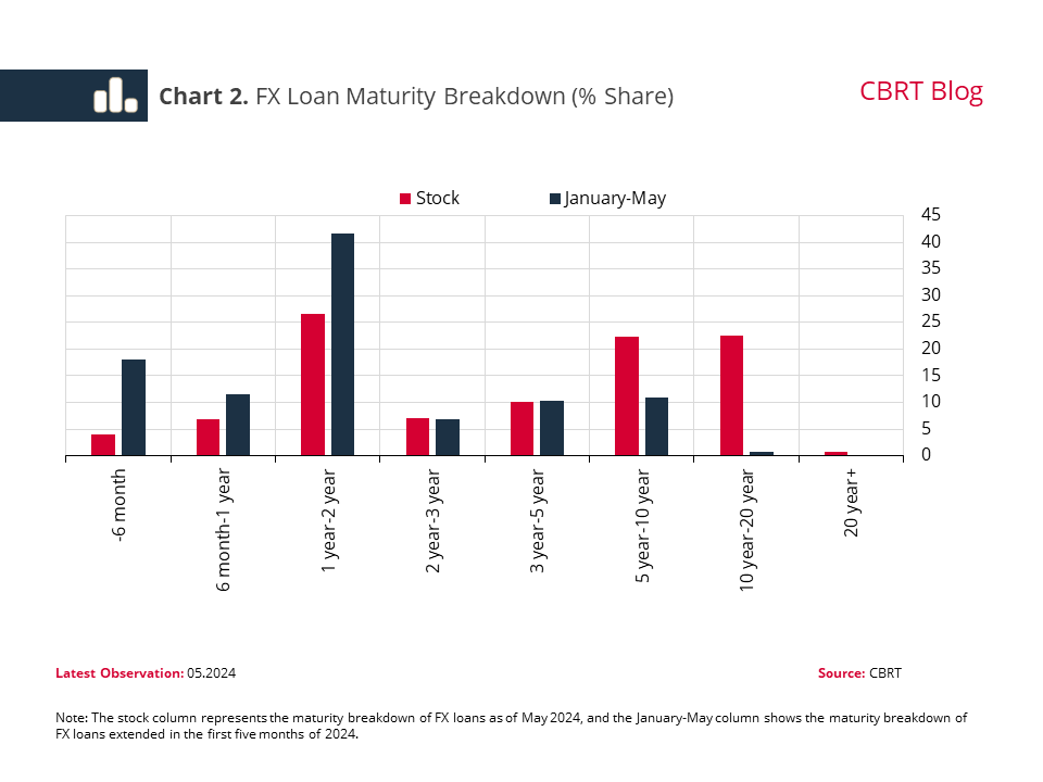 Development and composition of loans are important to domestic demand conditions, as well as to price and macrofinancial stability. Following a decline after 2018, foreign exchange (FX) loans have recently assumed an upward trend. Subsequent to this uptick, the Central Bank of the Republic of Türkiye (CBRT) took additional tightening steps in support of the tight monetary policy. On 23 May 2024, reserve requirements were introduced to FX loans in excess of a monthly growth limit of 2%, excluding loans for investment purposes, a move designed to restrict FX loans. This study examines the dynamics of the recent increase in FX loans and analyzes the developments in loan maturities in view of supply/demand-side factors.