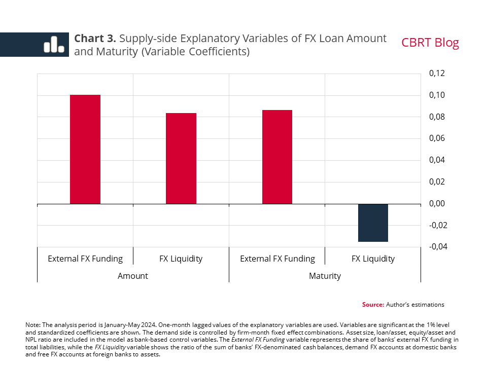 Supply-side factors are the focus of the model that control the firm demand. Results indicate a positive correlation between the shares of FX loan amount and external FX funding (Chart 3). On the other hand, there is a positive correlation between the FX loan maturity and the share of external FX funding, in contrast to a negative one with the FX liquidity. In other words, banks with a higher share of external FX funding extend higher amounts of FX loans with longer maturities. A one-point increase in the external FX funding rate pushes banks’ FX loan amount up by 0.8% and the maturity by 0.7%. However, it is notable that banks with higher FX liquidity extended higher amounts of FX loans with shorter maturities. A one-point increase in the FX liquidity ratio increases the FX loan amount by 3.6%, but shortens the maturity by 1.5%.