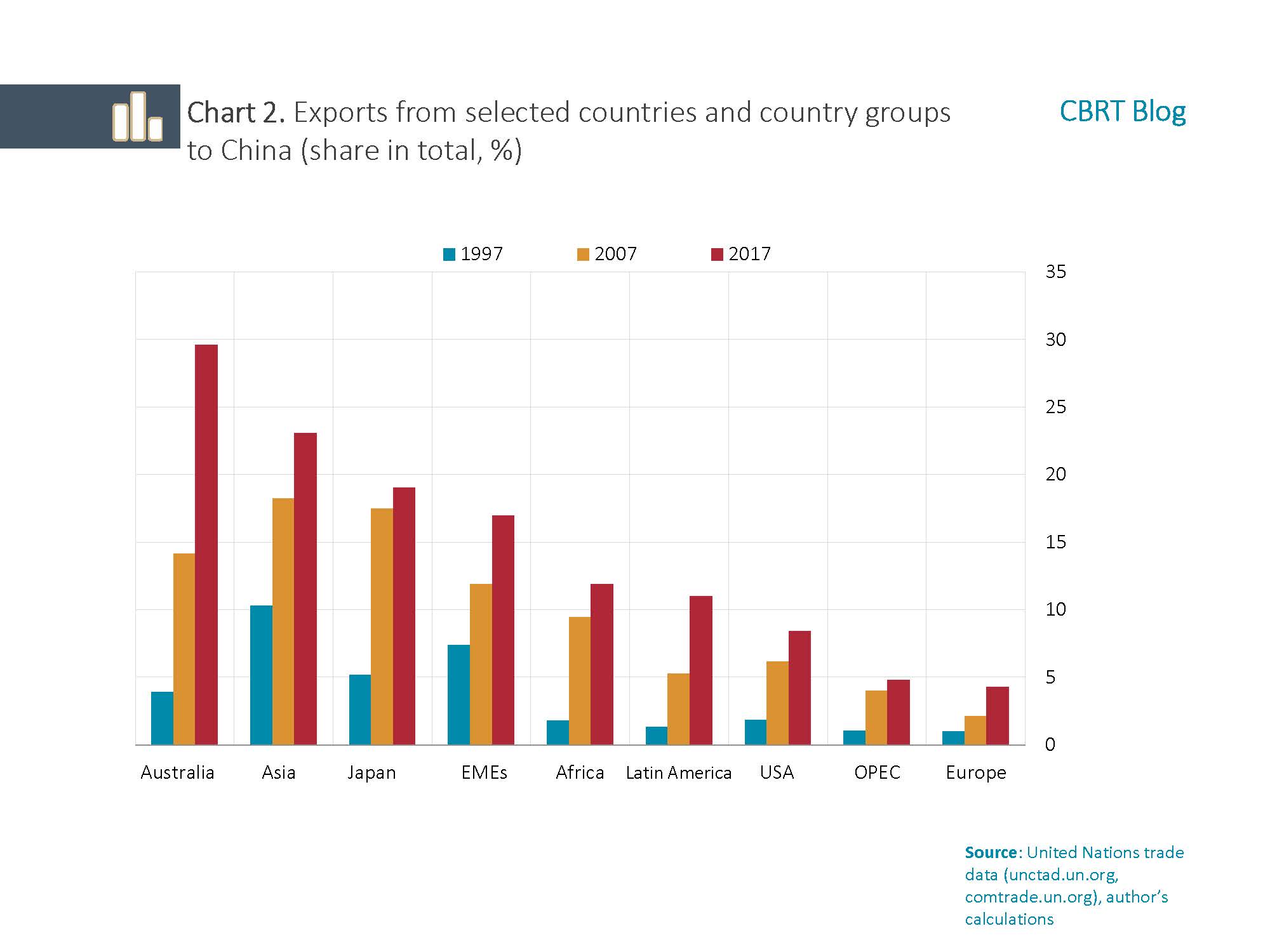 Countries that are more exposed to changes in the Chinese economy through trade are mostly from Asia Pacific due to both their geographical proximity and their position in the value-added chain. These countries are followed by exporters of raw materials, particularly from Africa and Latin America. Due to the abovementioned factors, countries vulnerable to changes in China include Japan and Australia, though they are among advanced economies, which demonstrates that emerging economies are not necessarily the only ones exposed. These trade implications of China are also documented by academic studies.