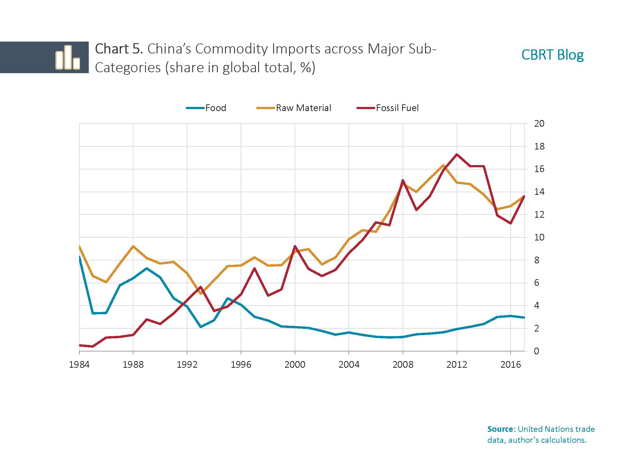 Currently, the most obvious channel through which the turmoil in China can affect the overall Turkish economy, both positively and negatively, is the prices of raw materials. China has been the biggest oil importer in the world since 2018, and its energy demand is increasing every day. Thus, being an importer of raw materials, particularly energy, Turkey may see less pressure on its current account deficit and inflation from a possible Chinese economic slowdown. On the other hand, food imports that resumed their uptrend in the last decade due to China’s consumption-oriented economic transformation may push global food prices higher and higher, which can be noted as an upside risk (Chart 5).
