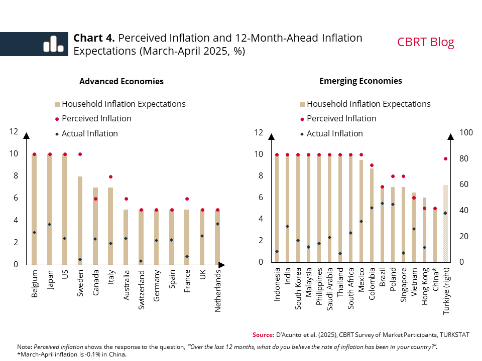 Inflation expectations play a significant role in inflation dynamics, as they influence multiple channels, including consumption and saving decisions, portfolio preferences, and pricing behaviors. In line with its primary objective of price stability, the Central Bank of the Republic of Türkiye (CBRT) employs the inflation expectations of economic agents as a key input in policy formulation. In this blog post, we examine the role of perceived inflation, prominent items in the consumer basket, and central bank communication in shaping household expectations through a comparative lens of global examples.