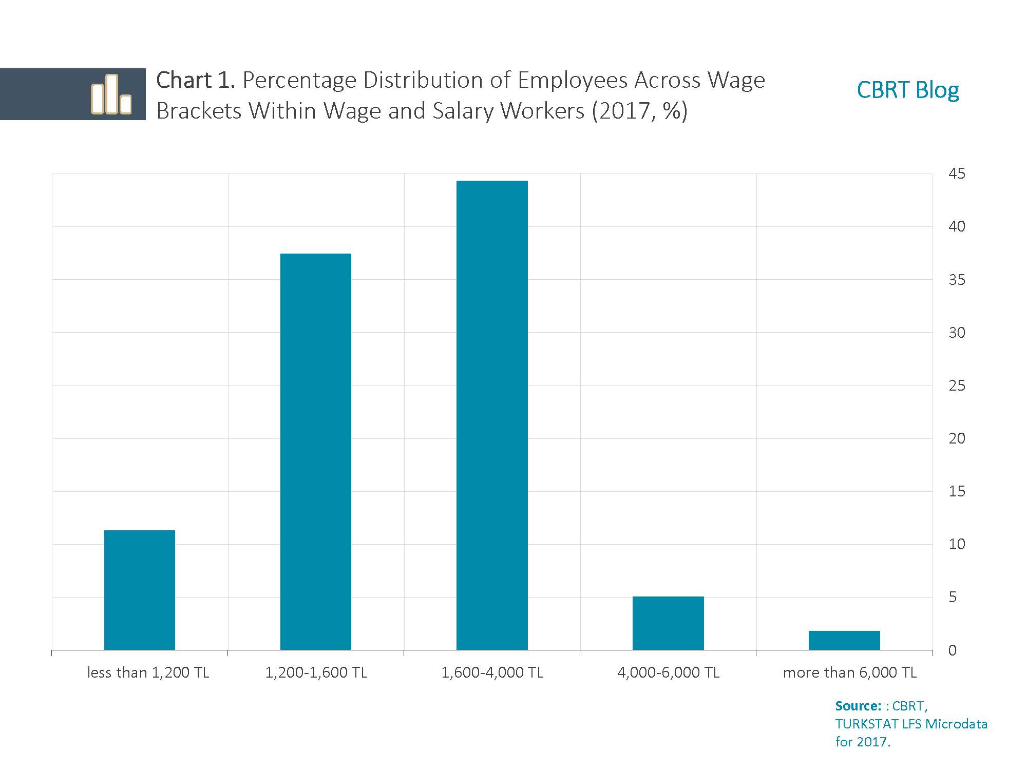 Another question in hand is how wages are distributed in Turkey. To answer this question, one may analyze wage and salary employees using micro data from the Labor Force Survey (LFS) of 2017. The LFS is a household survey that provides information on total net cash income (in addition to earnings paid to employees, benefits in cash and in kind, bonuses and premiums, etc.) received in the previous month. Accordingly, as of 2017, wage and salary workers account for 67.3% (18.9 million people) of total employment. Across wage brackets, 11.3% of wage and salary workers received an income less than 1,200 TL, while 37.5% earned in the neighborhood of the minimum wage (1,200-1,600 TL) and 44.3% declared an income between 1,600 TL and 4,000 TL (Chart 1).