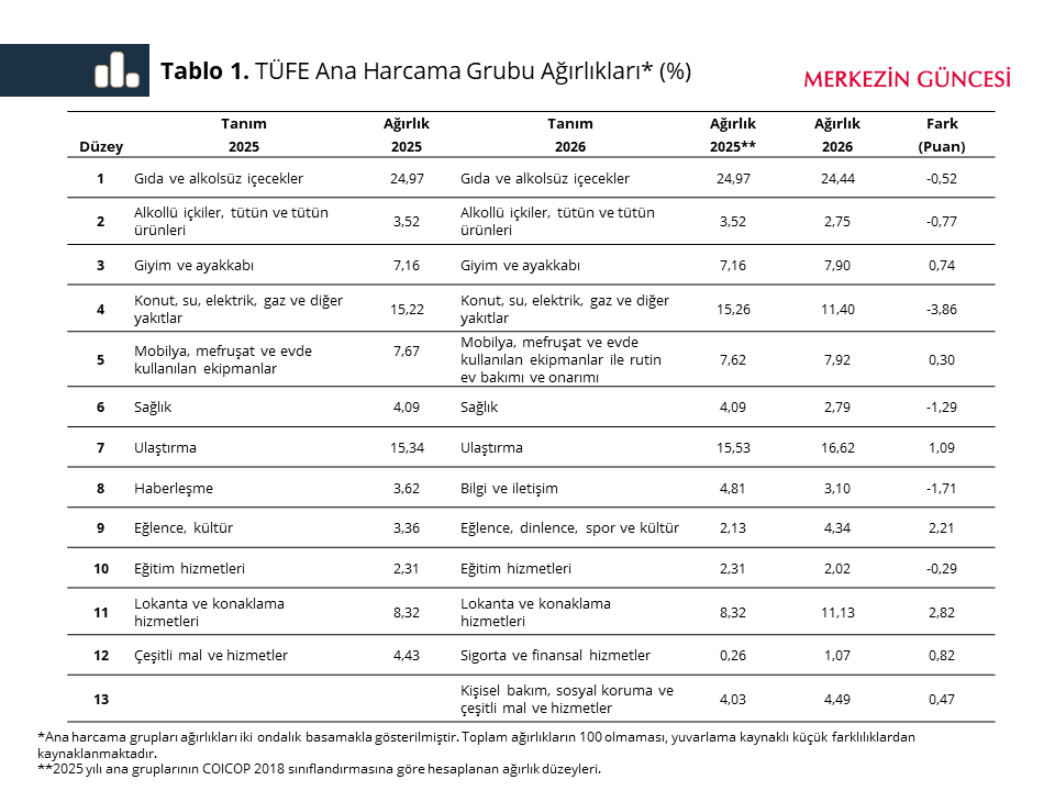 İkili düzeydeki ana harcama gruplarında ise ağırlıklar bir önceki yıla kıyasla en fazla konut, su, elektrik, gaz ve diğer yakıtlar grubunda azalırken, bunu bilgi ve iletişim ile sağlık izledi. Ağırlıkların en fazla arttığı gruplar ise değişen tüketim kalıplarının yansıdığı lokanta ve konaklama ile eğlence, dinlence, spor ve kültür grubu oldu. Diğer ana harcama gruplarında ise ağırlık değişimleri görece sınırlı oldu (Tablo 1).