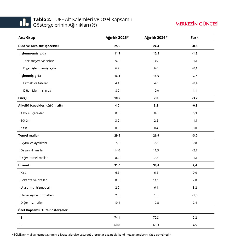 Hizmet grubu ağırlığındaki yükselişe karşın diğer ana grup ağırlıkları 2025’e kıyasla azalıyor. En belirgin düşüş 3,2 puan ile enerji grubunda. Bu grupta şebeke suyu yanında sübvansiyonların da etkisiyle elektrik ve doğal gaz kalemleri öne çıkmakta. Temel malların 2026 yılında ağırlığında 3,0 puan gerileme var. Bunun sürükleyicisi dayanıklı mallar. Gıda grubu ağırlığında sınırlı bir gerileme olmasına rağmen alt kırılım bazında farklılaşan bir görünüm mevcut. İşlenmemiş gıdanın ağırlığı taze meyve-sebze kaynaklı olarak gerilerken işlenmiş gıdanın ağırlığı artıyor. Tüm bu gelişmeler neticesinde, B ve C göstergelerinin ağırlıkları 5,2 ve 4,5 puan yükselişle sırasıyla yüzde 79,3 ve yüzde 65,3’e ulaştı.