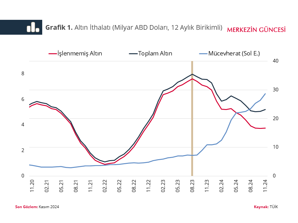 Son yıllarda, pandemi ve jeopolitik riskler gibi nedenlerle altına olan küresel talepte ve altın ons fiyatında artış yaşanmakta. Bu ortamda, hanehalkının geleneksel olarak altın tutma eğiliminin yüksek olduğu Türkiye’de işlenmemiş altın ithalatında önemli artışlar oldu. Öte yandan, 7 Ağustos 2023 tarihinden itibaren geçerli olan kota uygulaması ile işlenmemiş altın ithalatı hızlı bir şekilde geriledi (Grafik 1). Ağustos 2023’te 12 aylık birikimli olarak 34 milyar dolar seviyesinde olan işlenmemiş altın ithalatı, 2024 yılı kasım ayı itibarıyla yarı yarıya azalarak 17 milyar doların altına kadar geriledi.