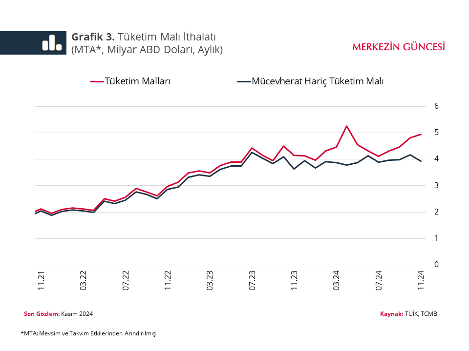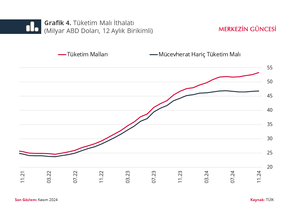 İki gösterge arasındaki ayrışma 12 aylık birikimli verilerde daha belirgin hale geliyor (Grafik 4). Yıllık tüketim malı ithalatı 2024 yılında artış kaydederken mücevherat hariç tüketim malı ithalatı yataya yakın bir patika izledi. Bu gözlemler, özellikle veriler aylık bazda yorumlanırken mücevherat etkisinin dikkate alınmasının önemini gösteriyor.