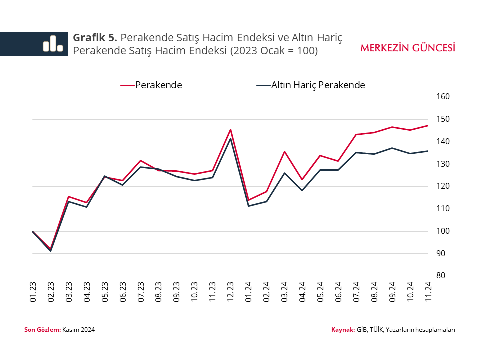 Dış ticaret verilerinde son dönemde gözlenen bu farklılaşmaya benzer bir durum perakende satış hacim endekslerinde de yaşanıyor. Cirosunun büyük çoğunluğu altın ve altın ürünleri satışlarından oluşan “saat ve mücevher perakende ticareti” alt sektöründeki gelişmeler perakende satış hacim endeksinin seyrini etkiliyor. Tüketim talebi eğilimini daha sağlıklı incelemek amacıyla toplam perakende sektörü satış hacminden “saat ve mücevher perakende ticareti” sektörü dışlanarak “altın hariç perakende satış hacim endeksi” oluşturuluyor.[1] Bu endeks, 2023 yılının haziran ayından itibaren belirgin bir şekilde perakende sektörü satış hacim endeksinin altında, 2024 yılı temmuz ayından itibaren de yatay bir seyir izliyor (Grafik 5).