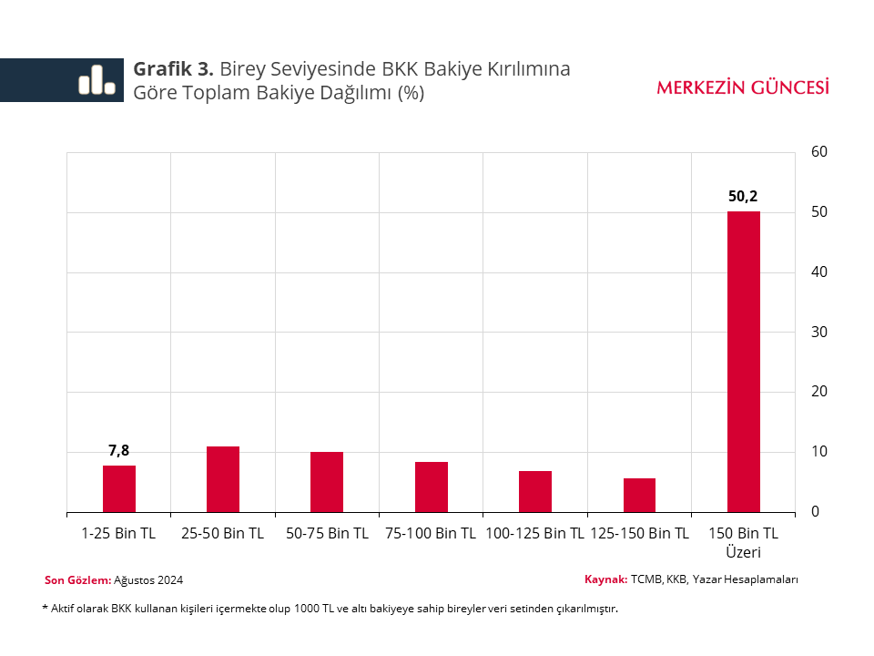 Bireysel kredi kartlarının hanehalkı tarafından yaygın kullanımı ve aylık harcamalardaki dalgalanmayı yumuşatan rolü göz önünde bulundurularak azami akdi faiz diğer bireysel kredi türlerinin altında belirleniyor.[3] Bu durum, BKK kanalından borçlanmayı ve tüketimi teşvik ediyor. Diğer yandan, BKK borç bakiyesini kredilendirme davranışının yüksek bakiye gruplarında daha yaygın olduğu görülüyor. Kart kullanıcılarının büyük bölümünün yer aldığı düşük bakiye gruplarında ise kredilendirme davranışının daha sınırlı olduğu gözleniyor. Dolayısıyla, BKK bakiyesinin sürükleyicisi olan yüksek bakiyeli grubun kredilendirme motivasyonunu azaltacak düzenlemelere ihtiyaç duyuluyor. TCMB’nin yakın zamanda kart bakiyesine göre kredi kartı azami akdi faizlerinde farklılaşmaya gitmesini de bu bağlamda değerlendirmek gerekiyor.