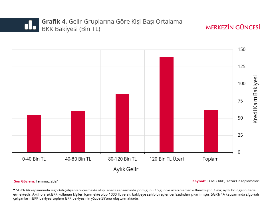 Bakiyelerin kart kullanıcıları bazında gösterdiği farklılaşma, aynı zamanda söz konusu bireylerin gelir profilleriyle de büyük ölçüde uyum arz ediyor (Grafik 4). Ücretli çalışanların idari kayıtları baz alınarak yapılan hesaplamaya göre gelir arttıkça BKK bakiyeleri de artıyor. Yüksek BKK bakiyelerinin aylık brüt gelir dağılımının üst diliminde yoğunlaştığı dikkat çekiyor. TCMB’nin atmış olduğu adımın yüksek gelirli bireylerin BKK bakiyelerinin büyümesine sıkılaştırıcı etki yapması bekleniyor.