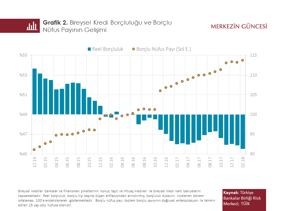 2014 sonrası dönemde bireysel kredi borcu bulunanların[1] 15 yaş üzeri nüfusa oranı yüzde 45’ten yüzde 54’e yükselirken borçlu başına düşen reel borç, 2016 yılının ikinci yarısından itibaren incelenen dönemler ortalamasının gerisinde seyrediyor (Grafik 2).