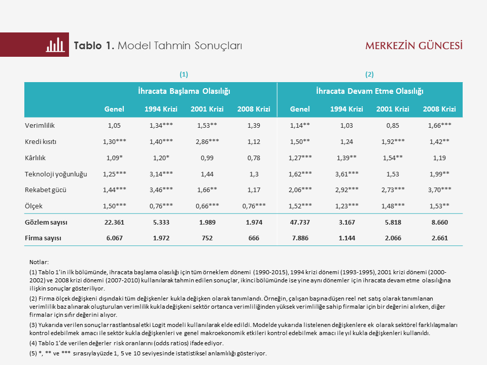 Ölçek, kredi kısıtı, kârlılık, rekabet gücü ve araştırma ve geliştirme (Ar-Ge) yatırımları ihracatçı olma ve ihracata devam etme olasılıklarını etkileyen faktörler. Verimlilik ise firmaların ihracatçı olma olasılığını etkilemezken, ihracat piyasalarında sağ kalma olasılığını artırıyor.