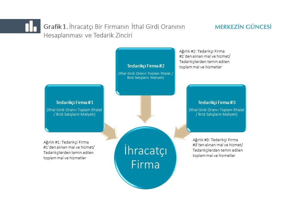 Sektör bazında veri ile yapılan ithal girdi hesabı sektör seviyesindeki toplam ithalat ile satışı oranlamakla başlıyor. Sektörün ithalatı haricinde TÜİK tarafından 2002 ve 2012 yıllarında yayınlanan sektörler arası girdi-çıktı tabloları kullanılarak, tedarik zincirinden gelen ithal girdi oranı da hesaba katılıyor. İhracatta ithal girdi oranı için ise sektörlerin toplam ihracata katkı oranları kullanılarak ağırlıklandırılmış ithal girdi ortalaması kullanılıyor.