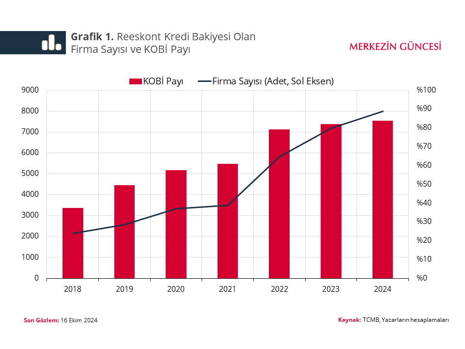 Reeskont kredilerinin etkinliğinin artırılması, cari dengeye daha güçlü katkı sağlanması ve daha fazla sayıda KOBİ’ye uygun finansman koşulları ile kredi kullandırılması amacıyla reeskont kredilerinin genel çerçevesinde son yıllarda önemli uygulama değişiklikleri gerçekleştirildi.[1] 2021 yılında yapılan değişikliklerle de net ihracatçılık şartı firma seçiminde temel belirleyici oldu. Ayrıca günlük reeskont kredi kullandırım limitleri kademeli olarak artırılarak finansman imkânı daha erişilebilir hale getirildi. 2018 aralık ayında yaklaşık 2.100 olan reeskont kredisinden faydalanan firma sayısı 2024 yılı ekim ayında yaklaşık 8.000’e ulaştı. KOBİ’lerin reeskont bakiyesi bulunan firmalar içerisindeki payı ise bu dönemde yüzde 38’den yüzde 84’e yükseldi (Grafik 1).