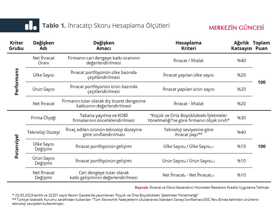 Söz konusu skorun hesaplamasında kullanılacak kriterler ve ağırlıkları Tablo 1’de gösteriliyor. Hesaplamalar, reeskont kredisi talebinde bulunan her bir firma için firmanın beyan ettiği veriler üzerinden bankalarca yapılıyor. Öncelikle, Tablo 1’deki her bir değişken için TCMB tarafından belirlenen eşik değerlere göre puanlama yapılıyor. Daha sonra, ilgili değişkenden alınan puan o değişkenin ağırlık katsayısı ile çarpılarak “performans” ve “potansiyel” puanları hesaplanıyor. Herhangi bir puan türünden 40 puan ve üzeri alan firmalar “ihracatçı skoru yüksek” olarak tanımlanıyor. Her iki puan türünden de 40 puan altında alan firmalar ise “ihracatçı skoru düşük” olarak tanımlanıyor.[2]