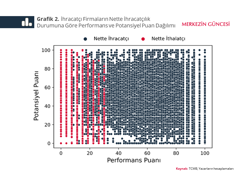 TCMB bünyesinde yer alan firma verilerini ve Tablo 1’de özetlenen yöntemi kullanarak mal ihracatçısı firmaların performans ve potansiyel puanlarını hesapladığımızda şu bulguya ulaşıyoruz: “Nette ihracatçı” firmalar, “nette ithalatçı” firmalara kıyasla, sadece performans değil aynı zamanda daha yüksek potansiyel puanına sahipler (Grafik 2).[3] Dolayısıyla, ihracatçı skoru uygulaması ile düşük potansiyelli nette ithalatçı firmaların yerine yüksek potansiyelli ihracatçıların reeskont kredilerinden daha fazla faydalanabilmesi amaçlanıyor. Bununla birlikte, nette ithalatçı olup yüksek katma değerli ihracat potansiyeli olan firmalar da reeskont kredilerinden yararlanabiliyor.