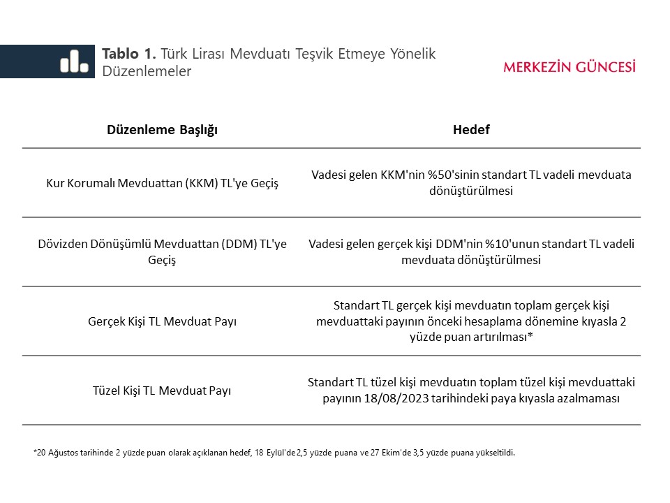 Türkiye Cumhuriyet Merkez Bankası, 2023 yılı haziran ayında başlayan parasal sıkılaşma sürecini desteklemek, parasal aktarım mekanizmasının etkinliğini artırmak ve makro finansal istikrarı güçlendirmek amacıyla makroihtiyati politika çerçevesinde Türk lirası mevduatların teşvik edilmesine yönelik bazı değişiklikler yaptı (Tablo 1). Bu yazıda, 20 Ağustos 2023 tarihinde açıklanan düzenlemelerin mevduat faizlerine etkileri inceleniyor.