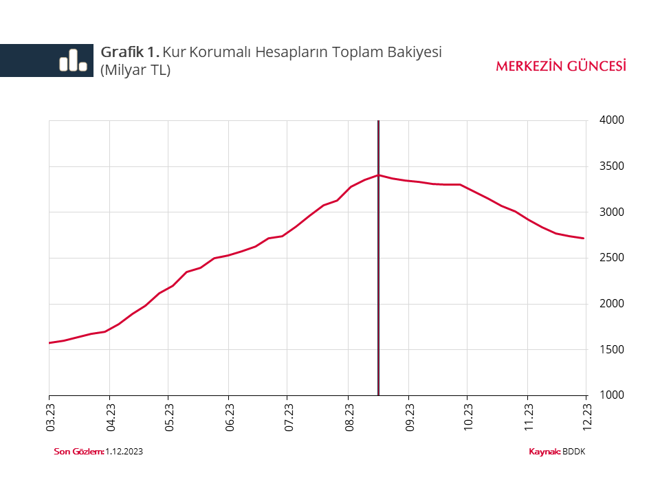 Yeni politika çerçevesinde kur korumalı mevduat (KKM) ve gerçek kişilere ait dövizden dönüşümlü mevduat hesaplarının (DDM) kademeli olarak TL mevduata dönüştürülmesi, YP mevduata geçişlerin asgari düzeyde tutulması ve bankaların TL mevduat payının yükseltilmesi hedefleniyor. 18 Ağustos’ta 3.408 milyar TL’ye yükselen toplam KKM ve DDM bakiyesi düzenleme sonrasında 1 Aralık’a kadar olan sürede 694 milyar TL azalarak 2.714 milyar TL seviyesine geriledi ve KKM ve DDM’nin toplam mevduattaki payı yüzde 26,2’den yüzde 19,2’ye düştü (Grafik 1).