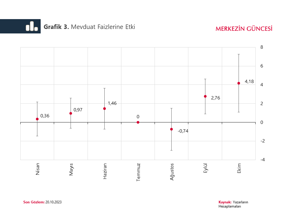 Grafik 2’de düzenlemenin etki analizleri görsel olarak sunuluyor. Grafikte “öngörülen” faiz oranı, düzenlemeler yapılmasaydı ve düzenlemeden az ve çok etkilenen bankaların faizleri paralel hareket etmeye devam etseydi, çok etkilenen bankaların faizlerinin nasıl seyredeceğini gösteriyor. Düzenlemeden çok etkilenen bankaların az etkilenen bankalara göre, düzenleme sonrasında gerçek kişi TL mevduatlarında ortalama 2,5 yüzde puan daha yüksek faiz uyguladığı görülüyor. Düzenlemeden çok etkilenen bankaların daha yüksek mevduat faizi ödemesi bu bankaların müşterilerinin TL mevduata dönüşlerini destekliyor ve sektör genelinde mevduat faizlerini ortalama 3,4 yüzde puan yükseltiyor.