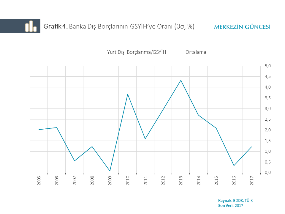 Sektörel düzeyde KMO artışına neden olabilecek birçok etken sayılabilir[4]. Türkiye özelinde, kredilerin bilanço içerisinde artan payına karşılık, mevduatın yükümlülükler içerisindeki payının yurtdışından sağlanan fonlar lehine azaldığı görülüyor. Bu durumun temelde ekonomideki tasarruf açığının bir yansıması olduğu değerlendirilmekte: mevduat artışlarının güçlü kredi talebini karşılamada yetersiz kalması, bankaları dış fonlama kaynaklarına yöneltiyor (Grafik 3).
