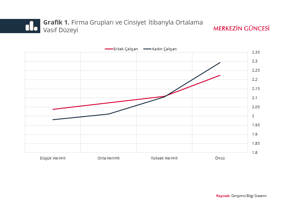 Firma grupları arasında cinsiyete göre ortalama vasıf düzeyi farklılaşması Grafik 1’de gösterilmekte. Buna göre gerek kadınlarda gerek erkeklerde firmaların verimlilik düzeyleri arttıkça çalışanların mesleki vasıf düzeyleri de artıyor. Ancak söz konusu eğilim doğrusal değil. Yüksek verimli firmalardan öncü firmalara geçildiğinde gözlenen artış diğer firmalar arasında gözlenen artıştan daha fazla. Cinsiyet kırılımına baktığımızda da önemli bir fark var. Diğer firma gruplarında kadınlar erkeklere göre daha düşük vasıf gerektiren işlerde çalışırken öncü firmalarda bunun tam tersi bir durum söz konusu. Bir diğer ifadeyle, verimlilikte öncü firmalar, kadınların yüksek vasıflı işlerde çalışması konusunda da öncü.